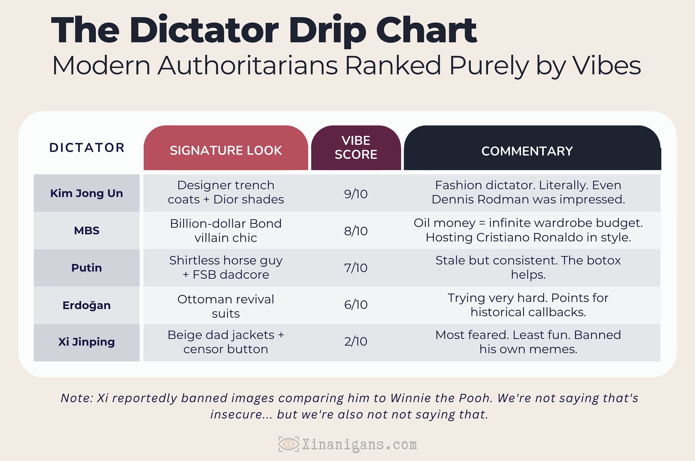 Maybe that’s why, of all the modern autocrats, Xi seems the least fun at parties. Kim Jong Un has the leather trenches. Putin has the shirtless calendar. MBS has the trillion-dollar desert cities. Xi? Xi has a beige windbreaker and a committee meeting.