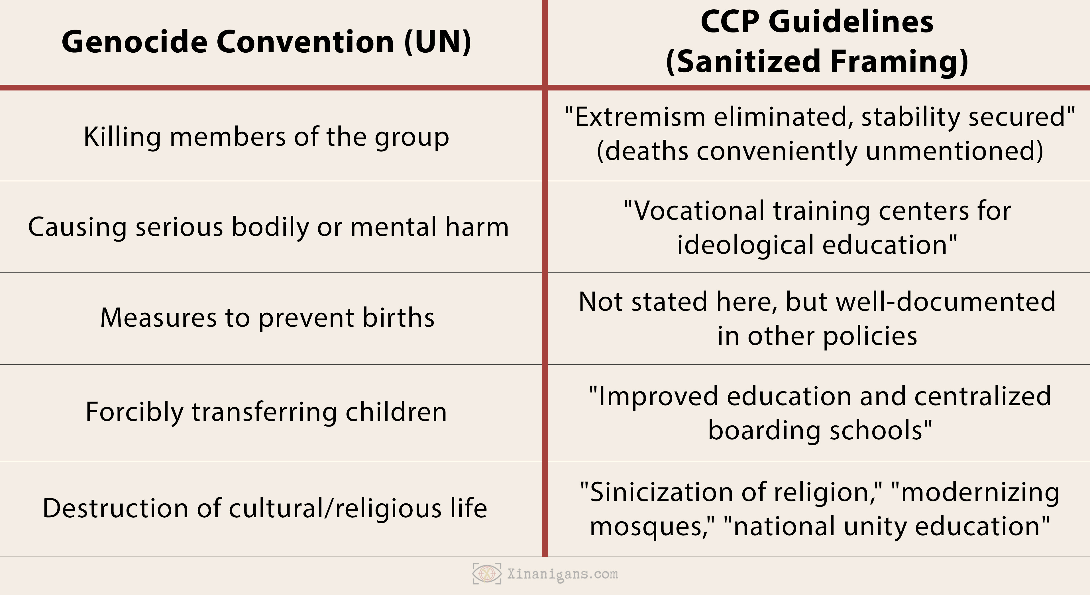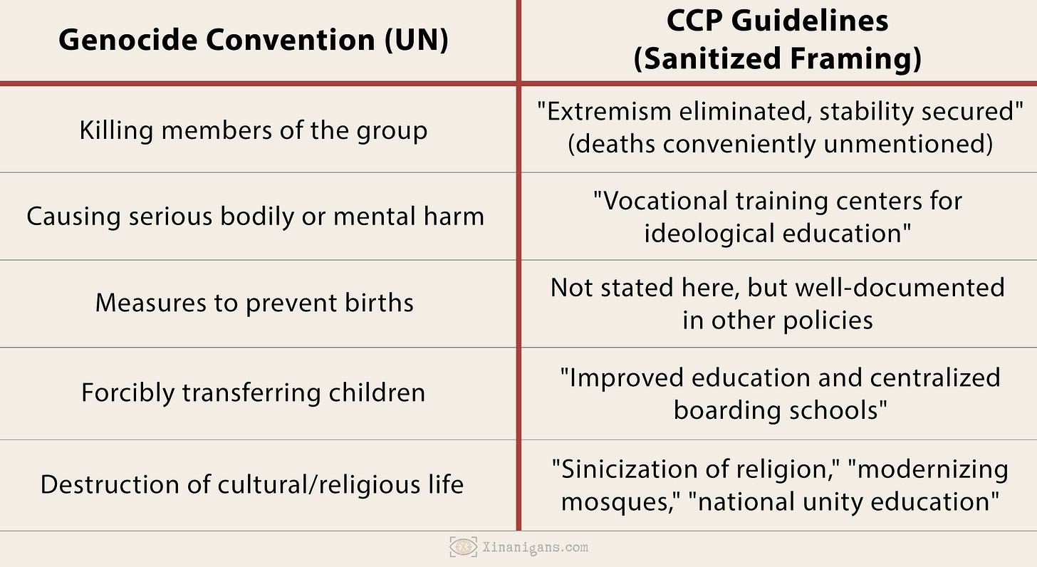 That “transformative change” encompasses mass surveillance networks, religious and linguistic erasure, systematic indoctrination programs, mass internment facilities, forced family separation, and cultural site destruction. The Guidelines don’t deny these actions occurred. Instead, they are celebrated as evidence of successful governance innovation.